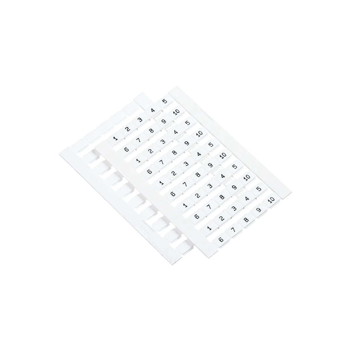 Боковая маркировка MTS-6M110 (символы 1…10) предназначена для нумерации и удобства визуализации при подключении проводников к клеммам. Маркировка поставляется в упаковках по 10 лент, каждая лента состоит из 10 маркировочных пластин.