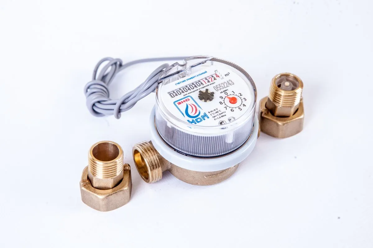 Счетчик воды универсальный ЭКО НОМ-15-80И+КМЧ-15-ОК (с латунным комплектом монтажных частей и с обратным клапаном, оснащен импульсным датчиком с передаточным коэффициентом 0.01 м3/имп)
